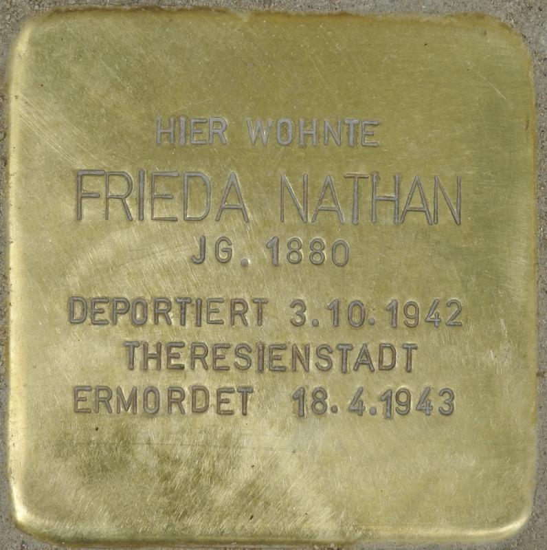 Heinrich Nathan verstarb 1885 – Frieda war gerade 5 Jahre alt – im Alter von 55 Jahren im Jüdischen Krankenhaus, seine Frau Antonie 71-jährig im Jahr 1910. Vielleicht zog Frieda schon bald nach dem Tod der Mutter zu ihrem Bruder Otto, der ab 1917 unter der Adresse Mommsenstraße 2 im II. OG gemeldet war.