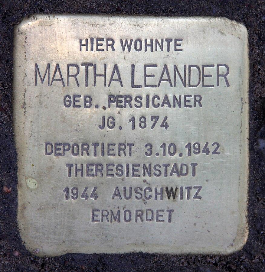 Martha Leander wurde zusammen mit ihrem Mann Alfred am 3. Oktober 1942 im sogenannten „3. großen Alterstransport" zusammen mit über tausend weiteren alten und kranken Menschen vom Bahnhof Grunewald aus nach Theresienstadt deportiert. Ihr Mann wurde dort am 26. Dezember mit 78 Jahren ermordet. Martha Leander musste die unmenschlichen Lebensbedingungen im Ghetto noch anderthalb Jahre lang erdulden. Am 16. Mai 1944 wurde sie nach Auschwitz überstellt, wo man sie wahrscheinlich gleich nach der Ankunft vergaste. Sie wurde 69 Jahre alt.