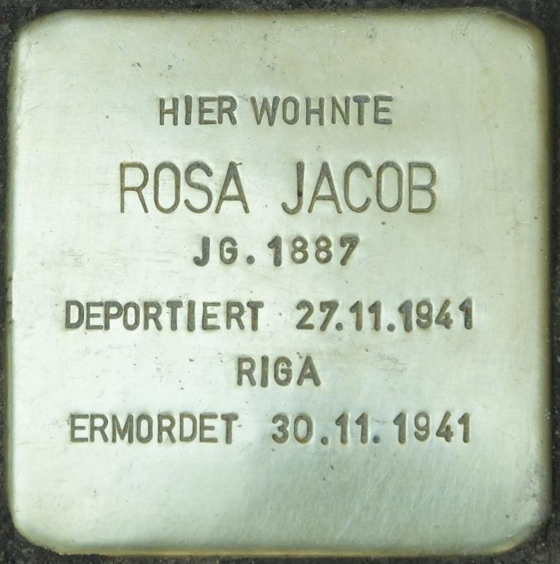 Rosa Jacob ist am 18. Juli 1887 in der ostpreußischen Kleinstadt Preußisch Holland (Pasłęk) südöstlich von Elbing geboren. Sie war die Schwester von Sally Jacob, der Junggeselle war. Zusammen mit ihm ist sie zunächst aus der gemeinsamen Wohnung an der Mommsenstraße 56 in die ehemalige, von der Geheimen Staatspolizei (