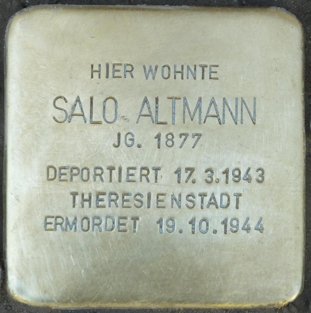 Salo Altmann war Kaufmann, er lebte mit seiner Familie zunächst in der Wielandstraße 40 und zog später in die Mommsenstraße 67 in eine 3-Zimmer-Wohnung im Gartenhaus, 1. Treppe. Salo und Johanna Altmann wohnten bis zu ihrer Deportation in ihren eigenen Räumen, eine umfangreiche Inventarliste in der Vermögenserklärung zeugte von einem intakten Haushalt.