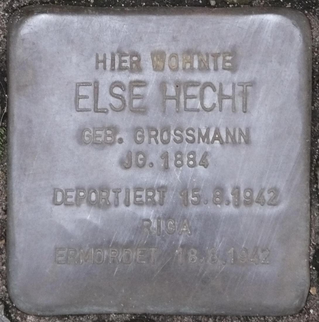 Else Hecht née Grossmann was born on April 28, 1884 in Schweidnitz (Świdnica) in Silesia. She was a beautiful woman and a dressmaker by profession. She had been married to Karl Hecht since around 1904. He ran a men's clothing store in Plauen in the Vogtland and she ran a women's clothing store on Bahnhofstrasse. The two daughters Ernestine, born on March 15, 1909 in Düsseldorf, and Eva Ingeborg, born on November 26, 1912 also in Düsseldorf, managed to escape to Palestine and England. The parents stayed in Berlin. Karl Hecht died of pneumonia in the Jewish Hospital Moabit in January 1942 and was buried in the Jewish Cemetery in Weißensee. Their older daughter Ernestine, who died in 1969, never spoke about the family history.