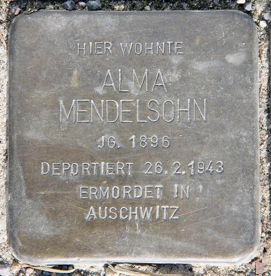 Der Entrechtung folgte die Deportation : Am 1. Oktober 1941 hatte die Gestapo die Jüdische Gemeinde Berlins informiert, dass die „Umsiedlung“ der Berliner Jüdinnen und Juden beginnen würde. Im Sommer 1942 wurde die Familie Mendelsohn gewaltsam auseinandergerissen. Almas Eltern erhielten den Deportationsbescheid, mussten ihr Zimmer in der Dresdener Straße räumen und wurden im August 1942 im Sammellager an der Großen Hamburger Straße 26 interniert. Von dort aus wurden sie am 7. August 1942 mit dem „39. Alterstransport“ in das Ghetto Theresienstadt deportiert und wenige Wochen später, am 26. September 1942, weiter in das Vernichtungslager Treblinka, wo sie ermordet wurden. Alma wohnte noch bis Frühjahr 1943 in Berlin. Sie wurde im Vorfeld der „Fabrik-Aktion“, bei der die letzten offiziell in der Hauptstadt verbliebenen Jüdinnen und Juden deportiert werden sollten, am 26. Februar 1943 mit dem „30. Osttransport“ aus Berlin in das Vernichtungslager Auschwitz deportiert und dort – vermutlich unmittelbar nach ihrer Ankunft – ermordet. Alma Mendelsohn war zum Zeitpunkt der Deportation 46 Jahre alt.