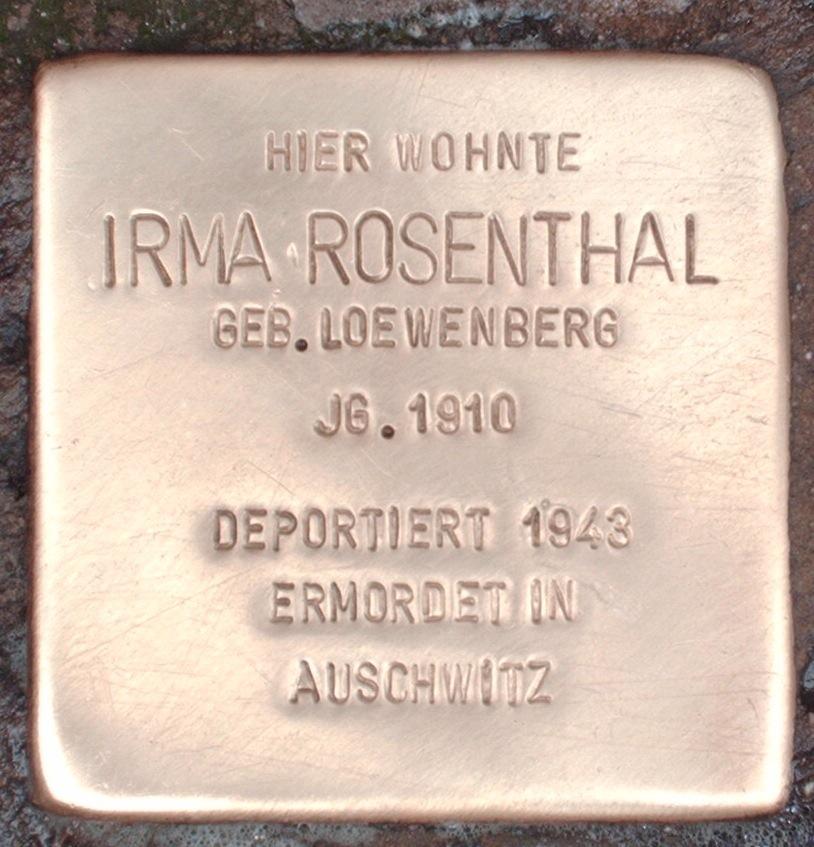 Irma Rosenthal, geb. Loewenberg, kam am 3. Juni 1910 in London zur Welt. Mit ihrem Mann Paul Rosenthal, geb. am 23. Juni 1903, gründete sie eine Familie und brachte 1929 und 1933 die Töchter Karla und Ellen zur Welt.