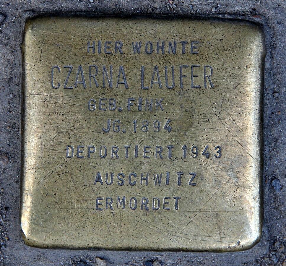 Czarna Laufer, geb. Fink, kam am 6. Mai 1894 in Zgórsko zur Welt. Ihr Ehemann, Jüdel Laufer, wurde am 30. August 1890 in Zalubince in Galizien geboren. Das Ehepaar hatte zwei Töchter, die beide in Berlin geboren wurden – Rita am 5. August 1929 und Margot am 5. Juni 1931. Die Familie lebte in der Neuen Schönhauser Str. 10 in Berlin-Mitte. Czarna Laufer war als Arbeiterin bei den Siemens-Schuckertwerken in Fürstenbrunn beschäftigt. Ihr Ehemann Jüdel Laufer wurde verhaftet und starb am 17. Februar 1940 im KZ Oranienburg. In den Vermögensunterlagen der Familie ist vermerkt: „Die Witwe Czarna wanderte mit den Töchtern Rita und Margot am 19. April 1943 mit dem 37. Osttransport aus“. Die Familie wurde mit diesem Transport nach Auschwitz deportiert und ermordet.