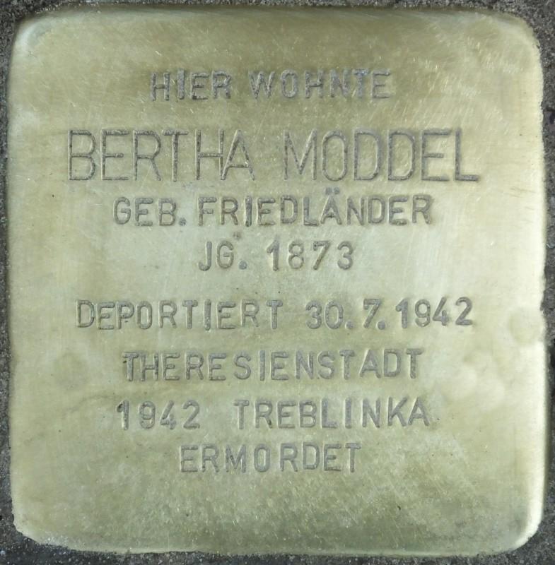 Am 30. Juli 1942 wurde Bertha Moddel im Alter von 70 Jahren aus der Mommsenstraße 45 nach Theresienstadt deportiert. Laut Akte beim Oberfinanzpräsidenten betrug der Wert ihrer Einrichtung 87,55 RM. Zwei Monate später, am 26. September 1942, wurde sie von Theresienstadt nach Treblinka abtransportiert und ermordet.