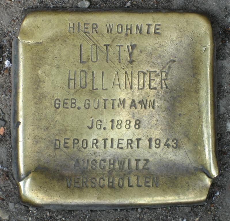 Lotty Hollander, geb. Guttmann, wurde am 9. Oktober 1888 in Hildesheim geboren. Sie war verheiratet mit Dr. Gottfried Hollander, geb. am 23. April 1876, der aus Posen stammte. Seit 1919 bewohnte das Ehepaar eine 6-Zimmer-Wohnung in der Oranienburger Str. 3 in Berlin-Mitte. Dr. Gottfried Hollander war promovierter Jurist und arbeitete als öffentlicher Notar und Rechtsbeistand. Als letzte Geschäftsadresse wird angegeben: An der Spandauer Brücke 3. Lotty Hollander wurde zur Zwangsarbeit bei der Firma Graetz in Berlin-Treptow in der Elsenstraße verpflichtet. Das Ehepaar Hollander wurde im Zuge der „Fabrik-Aktion“ deportiert. Gottfried Hollander wurde am 1. März 1943 mit dem „31. Osttransport“ nach Auschwitz verschleppt. Seine Frau Lotty wurde nur wenige Tage später, am 12. März 1943, mit dem „36. Osttransport“ ebenfalls nach Auschwitz deportiert. Die Eheleute gehörten bei der Befreiung des Lagers 1945 nicht zu den wenigen Überlebenden.
