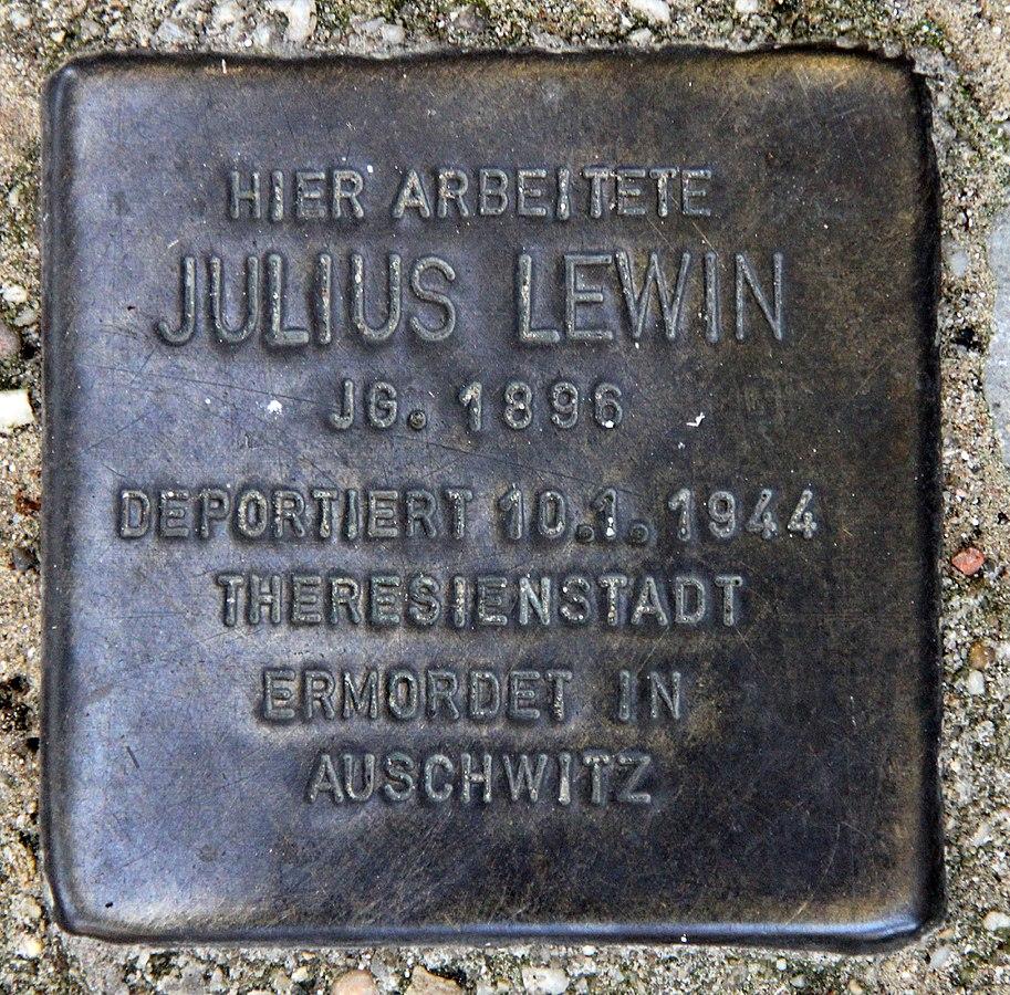 Am 7. Januar 1944 nahm die Gestapo Julius Lewin vor der Kohlenhandlung, in der er Zwangsarbeit leisten musste, fest. Man brachte ihn in das Sammellager in der Großen Hamburger Straße 26. Von dort wurde er am 10. Januar 1944 mit dem „99. Alterstransport“ in das Ghetto Theresienstadt deportiert.
