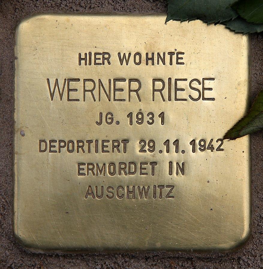 abgeben musste. Er wurde am 7. März 1886 in Berlin geboren und war Ingenieur, Dr. ing. Seine Frau Gertrud Riese geb. Barrach wurde ebenfalls in Berlin geboren, am 22. Oktober 1895. Sie hatten zwei Söhne, Günter Emil Riese, geb. am 9.März 1922 und Werner Riese, geb. am 4. April 1931. Adolf, Gertrud und Werner Riese wurden alle drei mit dem 23. Osttransport am 29. November 1942 nach Auschwitz deportiert, wo sie umkamen. Das offizielle Todesdatum wurde auf das Jahresende 1945 festgesetzt.