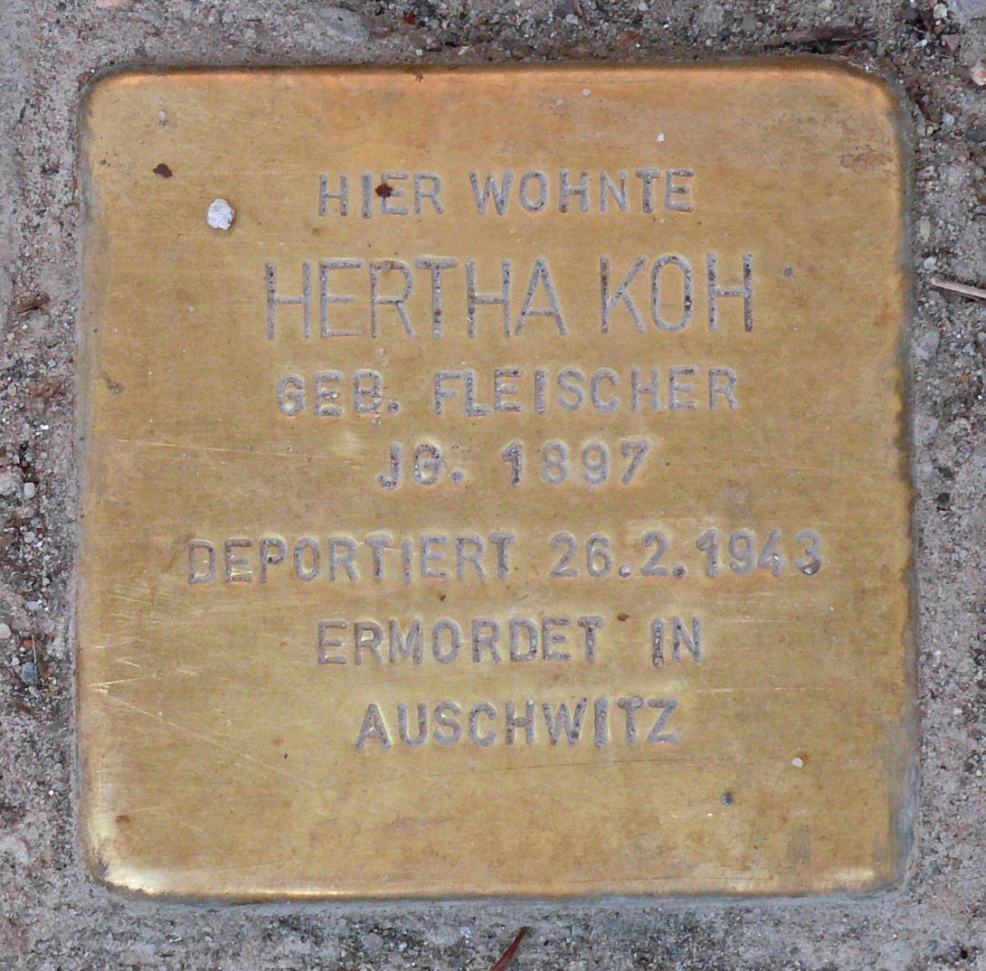 Hertha Koh lebte mit Mutter Martha und Bruder Alfred in der Wohnung in der Pariser Straße 17. Kurz vor der Deportation wurde sie in die Bamberger Straße 4 zwangsumgesiedelt. Sie wurde am 26. Februar 1943 nach Auschwitz deportiert und ermordet.