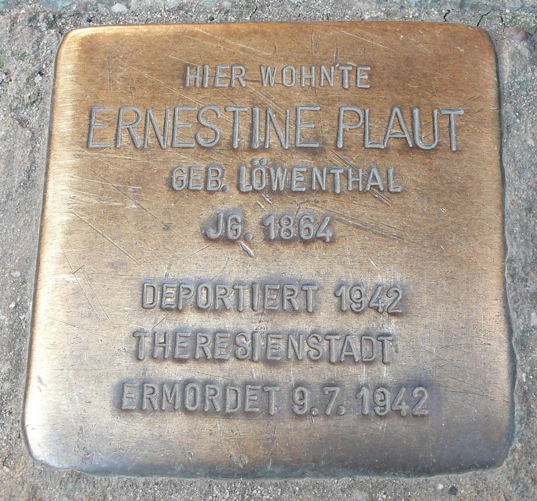 Ernestine Plaut geb. Löwenthal, wurde geboren am 3. Februar 1864 in Oderberg (Brandenburg). Ihr Vater war Samuel Löwenthal, ihre Mutter hieß Dosa geb. Wilde. Verheiratet war sie mit Hermann Plaut, der Sprachlehrer war und 1910 gestorben ist. Zunächst wohnte sie weiter in der Augsburger Straße 23 im Gartenhaus, Erdgeschoss und ließ ich mit dem Zusatz „Witwe Dozent“ oder „Lehrerwitwe“ ins Adressbuch eintragen.