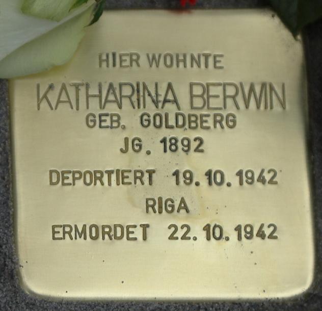 Katharina Goldberg heiratete den Kaufmann Ernst Berwin, geboren am 25. November 1892 in Naumburg a.d. Saale, der mit sieben Geschwistern in einer jüdischen Kaufmannsfamilie in Berlin aufgewachsen war. Sie hatten zwei Kinder: Barbara (*01.07.1924) und Alexander (*11.01.1926).
