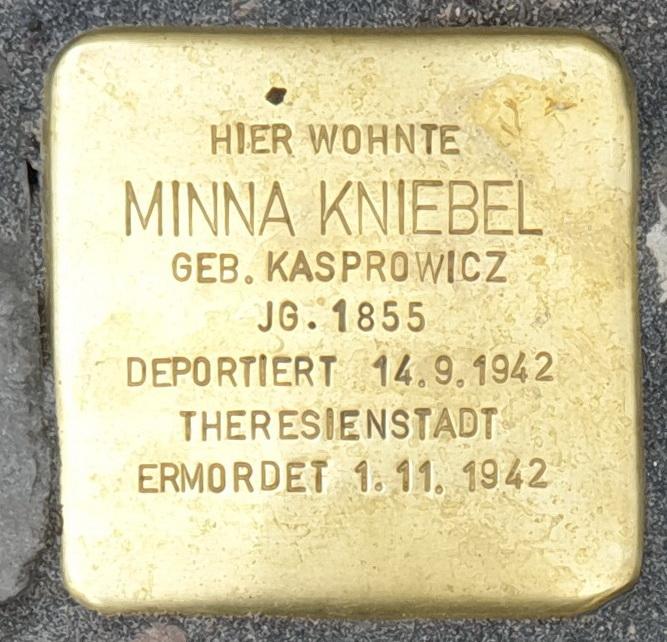 Am 14. September 1942, also knapp zwei Wochen nach ihrem 87. Geburtstag, wurde Minna Kniebel mit dem „2. großen Berliner Alterstransport“ nach Theresienstadt deportiert. In diesem hoffnungslos überbevölkerten Ghetto starben um den Jahreswechsel 1942/43 herum durchschnittlich 100 Menschen pro Tag, vor allem diejenigen aus den neu eintreffenden Transporten, weil sie auf die elenden Bedingungen dort nicht vorbereitet waren. Zu diesen gehörte auch Minna Kniebel. Nur sechs Wochen nach ihrer Ankunft starb sie in den frühen Morgenstunden des 1. November 1942.