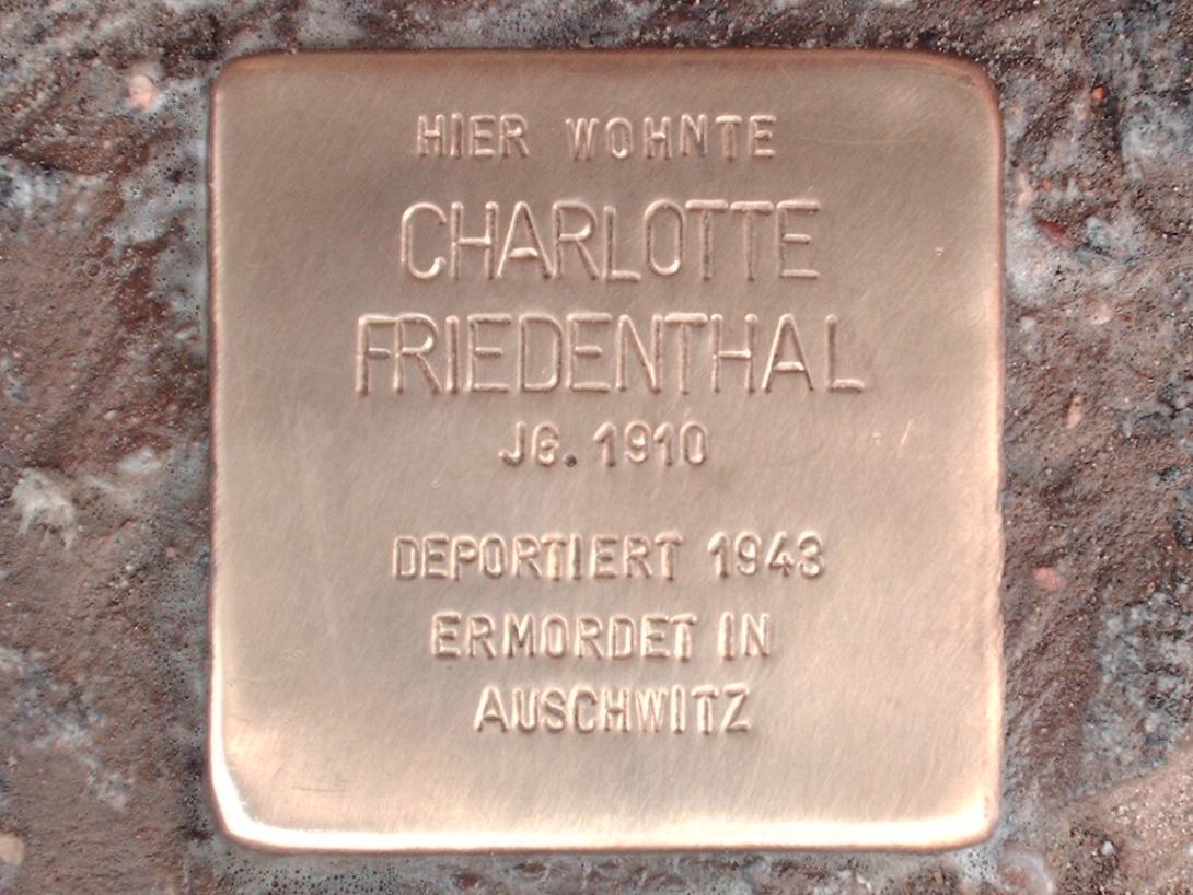 Vor ihrer Deportation musste Charlotte Friedenthal Zwangsarbeit in den Elektromotorenwerken (Elmo-Werken) der Firma Siemens und Schuckert leisten. Sie wurde vermutlich Ende Februar 1943 im Zuge der „ Fabrikaktion “ direkt an ihrem Arbeitsplatz verhaftet und in ein Sammellager gebracht. Sie gehörte zu den 1736 Juden und Jüdinnen, die am 1. März 1943 mit dem 31. „Osttransport“ nach Auschwitz deportiert wurden. Im Vernichtungslager angekommen, wurden nur 677 der Insassen des Transports als arbeitsfähig registriert. Charlotte Friedenthal war nicht unter ihnen. Die 32-jährige Berlinerin wurde vermutlich direkt nach ihrer Ankunft in Auschwitz in der Gaskammer ermordet.