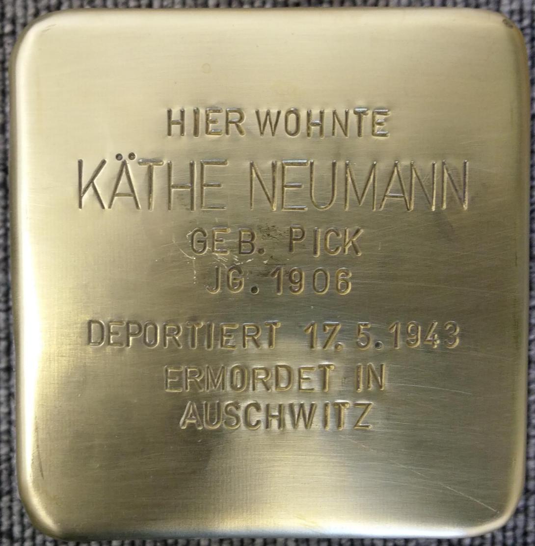Käthe Pick wurde am 10. Mai 1906 als zweites Kind ihrer Eltern Salo und Elfriede Pick (geb. Pinthus) in Rybnick, Schlesien geboren. Ihr drei Jahre älterer Bruder Albert starb in jungen Kinderjahren. Wann die Familie nach Berlin umzog, ist nicht bekannt. Als junge Frau lernte Käthe den gleichaltrigen Hans Neumann kennen. Beide stammten aus jüdischen Familien. Am 2. April 1932 heirateten Käthe und Hans in Berlin. In dieser Zeit müssen sie in die Ritterstraße 19 in Kreuzberg gezogen sein. Die Ritterstraße lag in dieser Zeit in einem regen Geschäftsviertel kleinerer und mittlerer Betriebe und war Herzstück einer großen jüdischen Gemeinde.