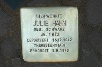 On December 15, 1942, Julie Hahn née Schwarz was deported from Berlin on Transport 1/80-10040 to Theresienstadt concentration camp. The next day, daughter Grete and her husband Werner Nathan were also deported to Theresienstadt, but managed to survive and are buried at Wuerzburg Jewish cemetery. Julie died at Theresienstadt on September 1, 1943, less than nine months after her deportation. She was 71. Her death certificate states she died of pneumonia, but grandson Max Nathan wrote in 1961 that Julie starved to death at Theresienstadt. She died about two months after daughter-in-law Margit and 16 year old Hans also joined her, daughter Grete and son-in-law Werner Nathan at Theresienstadt, and before she had to witness the 1944 ongoing deportation of Margit and Hans to their deaths at Auschwitz.