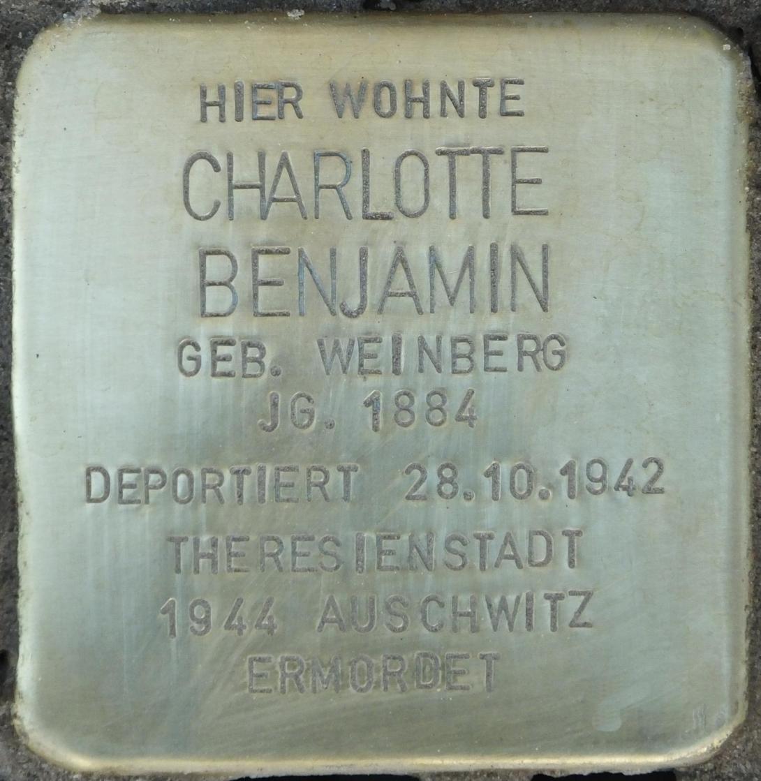 Richard und Charlotte Benjamin wohnten in der Schlüterstraße 16, kurz vor ihrer Deportation wurden sie zwangsweise in die Kantstraße 130 umquartiert. Sie wurden zunächst ins Sammellager Große Hamburger Straße 26 gebracht, um am 28. Oktober 1942 vom Anhalter Bahnhof nach Theresienstadt deportiert zu werden. Auf der Deportationsliste stand Richard Benjamin als „Behandler“, bei seiner Frau war der Vermerk „Pflegerin“ abgebracht.