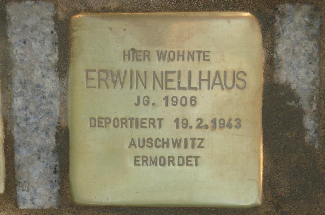 Erwin Nellhaus wurde am 31. August 1906 in Berlin geboren. Sein Vater war der Kaufmann Bernhard Nellhaus. Im jüdischen Adressbuch von 1931 wurden Bernhard und Erwin mit der gleichen Adresse aufgeführt, Dunckerstraße 88. Im allgemeinen Berliner Adressbuch wurde Bernhard Nellhaus erstmals 1897 genannt und seit 1906, Erwins Geburtsjahr, in der Dunckerstraße 88 in Prenzlauer Berg eingetragen. Erwin Nellhaus hatte im allgemeinen Adressbuch keinen eigenen Eintrag. 1935 wurde Bernhard darin letztmalig erwähnt, Erwin hatte da wohl schon woanders zur Untermiete gewohnt. Wann er in die Schlüterstraße 54 gezogen war, bleibt unklar, er wurde dort bei der Volkszählung im Mai 1939 in der „Ergänzungskartei“ in der Pension Phiebig erfasst.