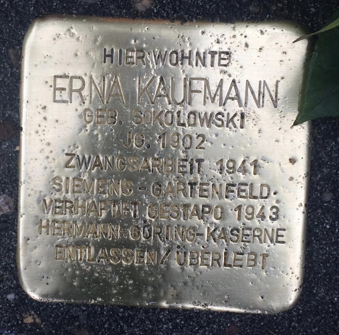 Ab dem Jahr 1941 stieg die Zahl der Zwangsarbeiterinnen und Zwangsarbeiter in Berlin sprunghaft an. Auch Erna Kaufmann musste ab Februar 1941 Zwangsarbeit bei Siemens-Gartenfeld leisten.