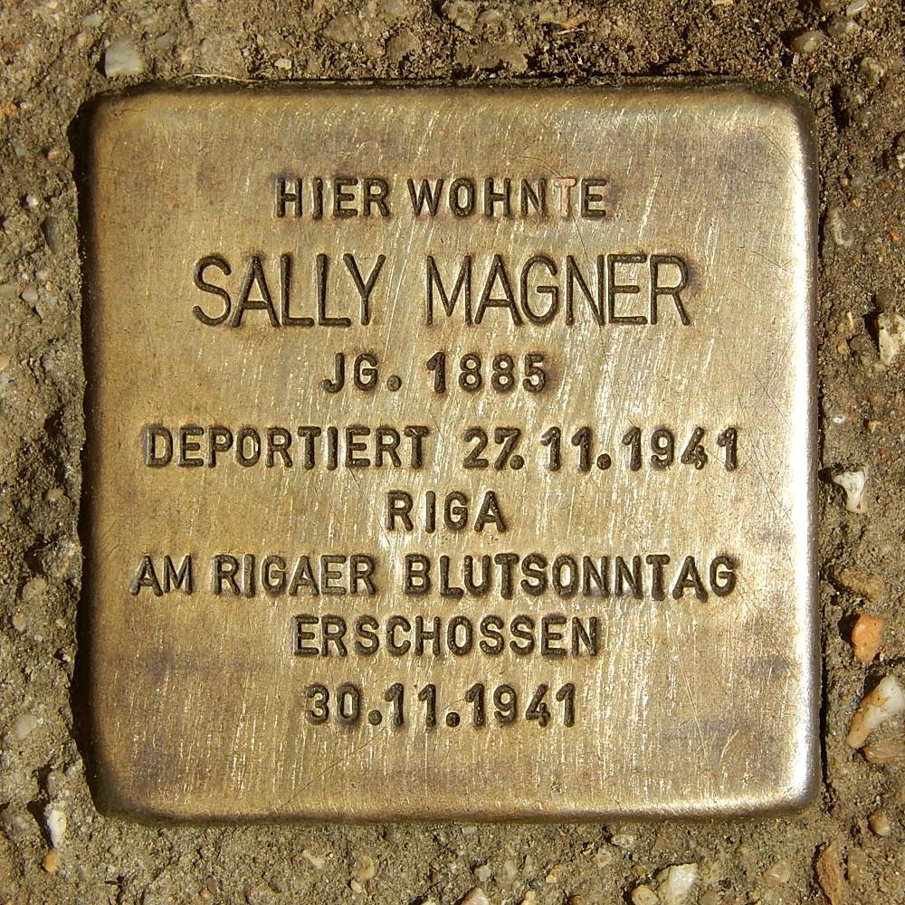 : Ende November 1941 wurden Sally und Erna Magner aus ihrer Wohnung im Braunen Weg 66 durch Polizeikräfte in das Sammellager in der ehemaligen Synagoge Levetzowstraße 7-8 verschleppt. Von dort aus wurden sie am 27. November 1941 über den Bahnhof Grunewald mit dem 7. Osttransport nach Riga deportiert. Dieser erste Berliner Transport mit Ziel Riga geriet mitten in das Chaos, das die Vorbereitungen der als „Rigaer Blutsonntag“ bekannt gewordenen Massenerschießung von mehr als 26.500 lettischen Juden aus dem