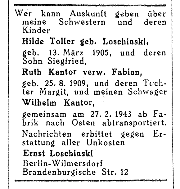 Am 2. März 1943 wurden die acht Jahre alte Enkeltochter von Johanna Loschinski und ihre Tochter Ruth nach Auschwitz deportiert und sofort ermordet.
