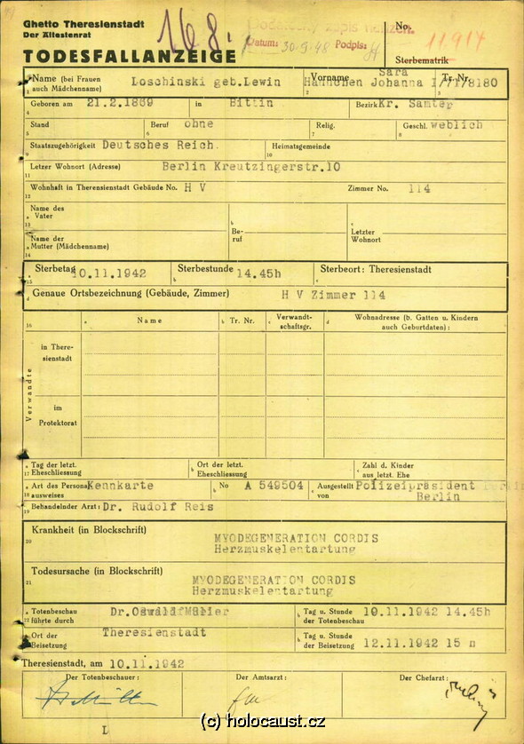 Von Johanna Loschinskis Kindern überlebte nur der Sohn Ernst den Holocaust. In ihrer Vermögenserklärung, die unmittelbar vor der Deportation ausgefüllt werden musste, hat Johanna Loschinski angegeben, dass Ernst als Kohlenarbeiter beschäftigt war.