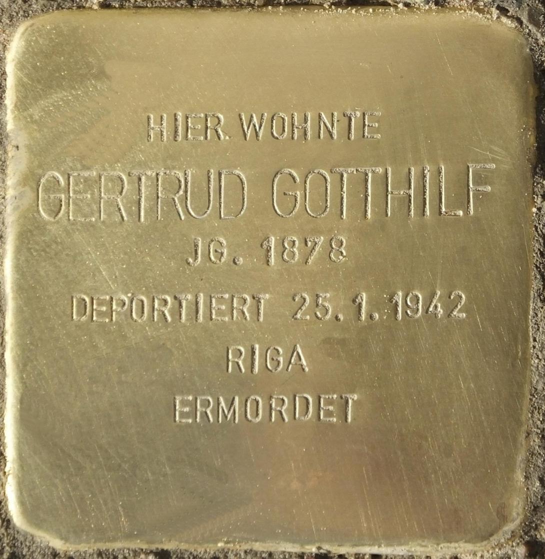 Gertrud Gotthilf wurde im Alter von 64 Jahren zunächst in die Synagoge Levetzowstraße zur Registrierung verschleppt und dann am 25. Januar 1942 vom Güterbahnhof Moabit in einem Zug mit 1044 Menschen bei bitterster Kälte in die lettische Hauptstadt Riga deportiert. Wenn sie bei der Ankunft nach fünf Tagen und Nächten noch nicht erfroren war, ist sie, wie fast alle Insassen dieses Transports, sofort erschossen worden.