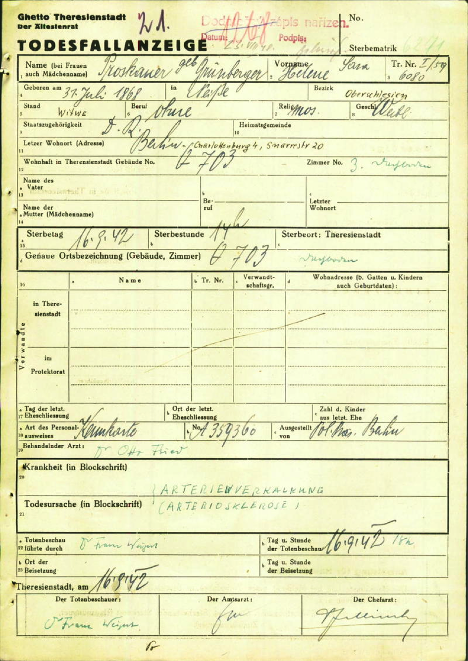 Helene Lara Proskauer wurde am 4. September 1942 nach Theresienstadt deportiert und kam dort am 16. September 1942 um. In der Todesfallanzeige wird als Todesursache „Arterienverkalkung, Arteriosklerose“ angegeben. Man weiß aber, dass diese Einträge in den meisten Fällen verschleierten, dass die Menschen an den Folgen von Hunger, mangelnder medizinischer Versorgung und den unbeschreiblichen hygienischen und allgemeinen Bedingungen im Ghetto verstorben sind.
