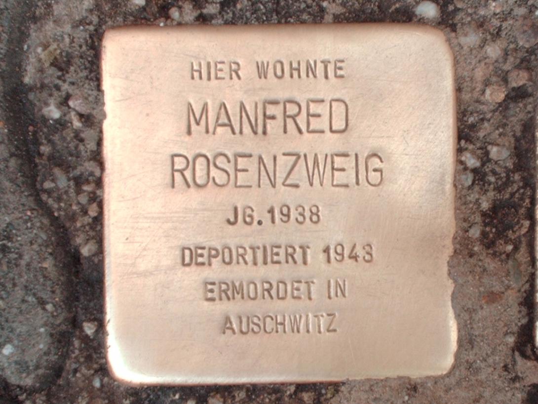 in der Lothringer Str. 34/35 (heute: Torstr. 89). Manfred Rosenzweig, gerade einmal vier Jahre alt, wurde, zusammen mit seiner Mutter und der Schwester, am 12. März 1943 mit dem „36. Osttransport“ nach Auschwitz deportiert und ermordet.