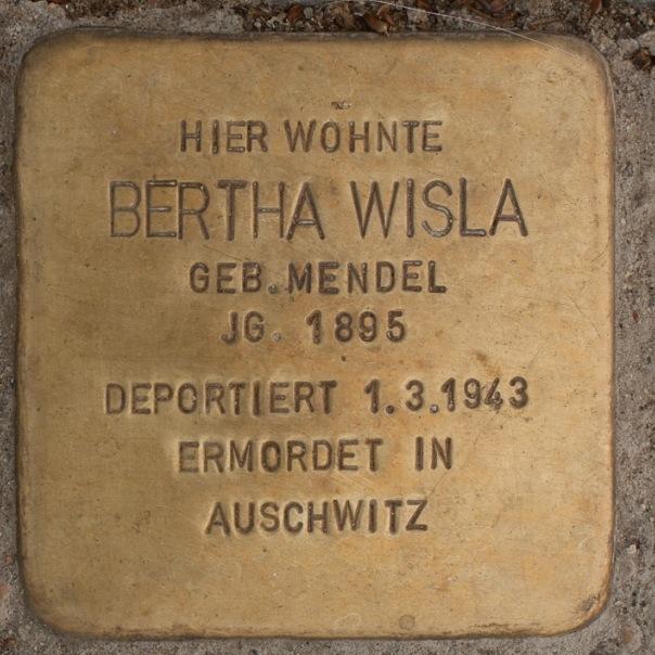 Bertha Wisla wurde, getrennt von ihrem Mann und ihrem Sohn, am 1. März mit dem 31. Osttransport nach Auschwitz deportiert. Der Zug erreichte das Vernichtungslager einen Tag darauf und am 3. März, dem Geburtstag ihres Mannes, wurde Bertha ermordet.