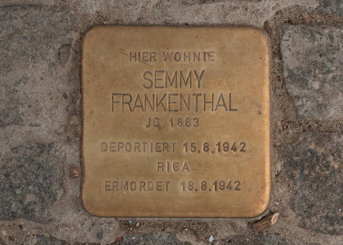 Am 15. August 1942 wurden Semmy Frankenthal und seine Frau Else mit dem 1004 jüdische Menschen umfassenden 18. Osttransport vom Güterbahnhof Moabit nach Riga deportiert. Zuvor hatten sie sich in der als Sammelstelle missbrauchten Synagoge an der Levetzowstraße einfinden müssen, um von dort in einem langen Fußmarsch unter den Augen der Moabiter Anwohner durch die Straßen Moabits zum Bahnhof zu laufen.