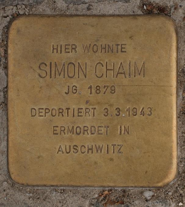 Simon Chaim wurde mit einem 1726 Menschen umfassenden Transport am 3. März 1943 nach Auschwitz deportiert. Es war der dritte Transport aus Berlin nach der Fabrikaktion.