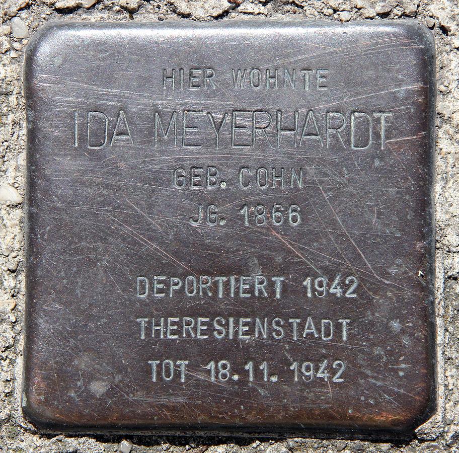 Ida Meyerhardt war Witwe, als sie am 14. Oktober 1942 nach Theresienstadt deportiert wurde. Dort lebte sie nur noch etwas länger als einen Monat. Die "offizielle" ärztliche Bescheinigung wies aus, sie sei herzkrank gewesen und an Altersschwäche verstorben.